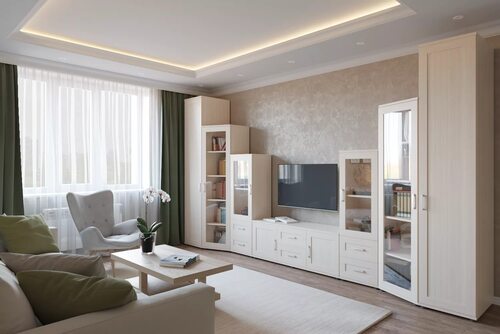 Многие стенки оборудованы открытыми полками, закрытыми секциями, выдвижными ящиками и даже подсветкой, что делает их универсальным и функциональным элементом мебели для зала.