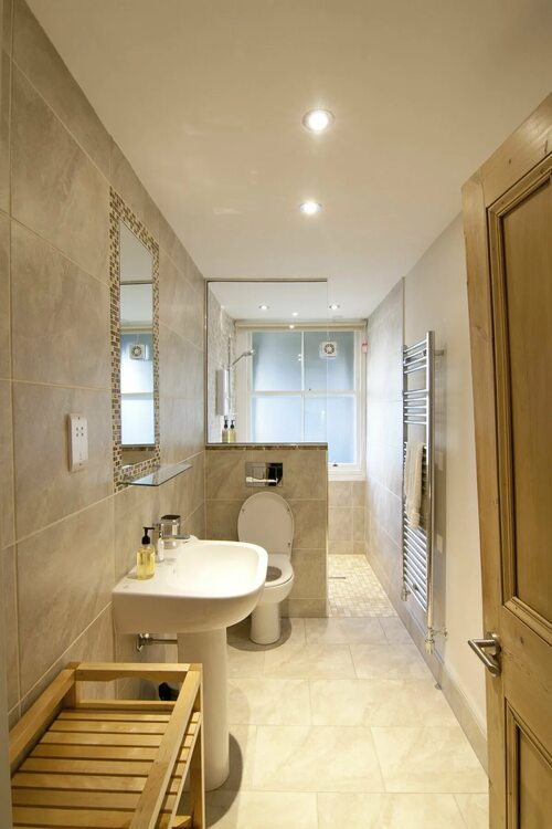 Для санузла длинного и узкого помещения важно выбрать компактные и функциональные элементы мебели и сантехники. Например, угловой унитаз и раковина, а также душевая кабина с прозрачными стенками, которые визуально не занимают много места.