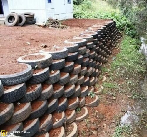 Наполните пространство между шинами грунтом и щебнем, укрепляя структуру подпорной стенки. Убедитесь, что все слои равномерно уплотнены.