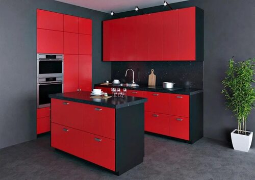 Мебель для кухни в черно-красной цветовой гамме станет ярким акцентом в любом интерьере. Эта комбинация цветов придает кухне современный и стильный вид, добавляя в нее нотку элегантности и роскоши.