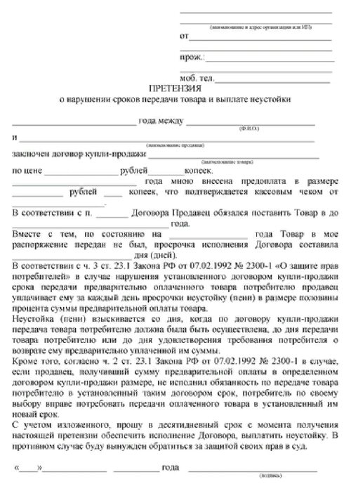 Составление претензии образец
