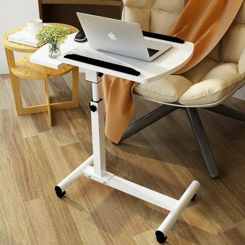 Столик для ноутбука белого цвета на колесиках имеет устойчивую конструкцию и легко перемещается благодаря колесикам. Он оснащен откидной столешницей, что позволяет регулировать угол наклона для комфортной работы. Кроме того, наличие боковых стоек предотвращает соскальзывание предметов во время перемещения столика.