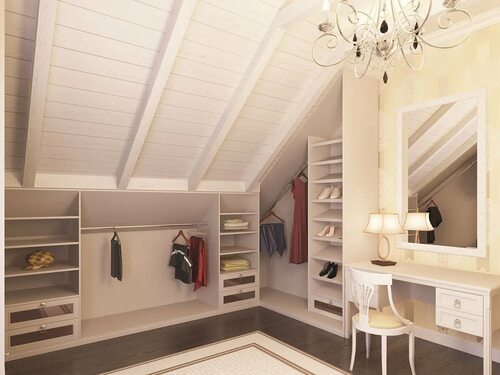 2. Скатные шкафы. Использование скатных шкафов позволяет оптимально использовать угловые пространства мансарды, обеспечивая дополнительное хранение без потери ценной площади.