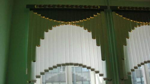 Фото 3: Жалюзи в виде арки с тканевыми вставками, создающие мягкость и уют в кухонном пространстве.