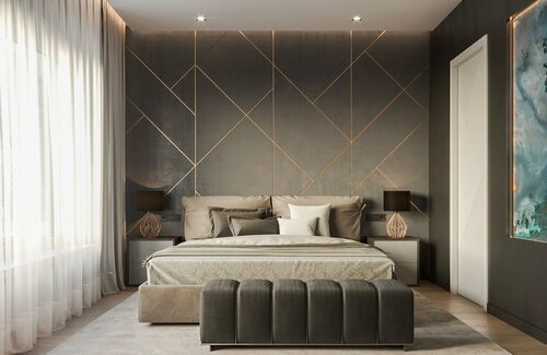 В классическом интерьере золотые полосы на стене могут добавить изысканности и роскоши. Этот дизайнерский прием часто используется для создания эффектного фокуса в помещении, подчеркивая роскошные детали интерьера.