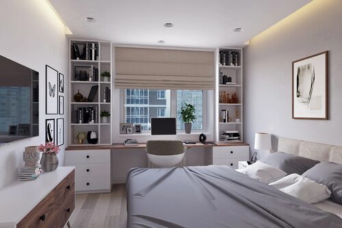 1. Разделение пространства: Используйте ширму или книжную полку в качестве разделителя между спальной зоной и рабочим уголком. Это поможет создать визуальное разделение между отдыхом и работой.