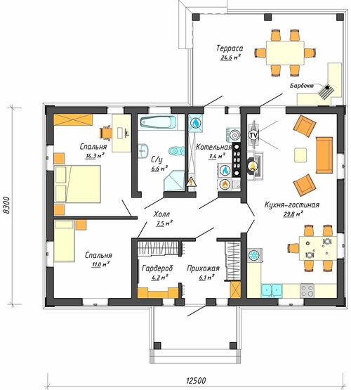 Ниже представлены фотографии различных вариантов планировок одноэтажных домов с двумя спальнями, гостиной и террасой. Вы сможете увидеть разнообразные варианты размещения комнат, расположения окон и дверей, а также дизайнерские решения для создания уютной и функциональной обстановки.