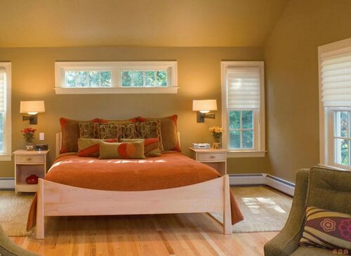 Существует несколько вариантов размещения окна над кроватью в спальне. Оно может быть расположено непосредственно над головной частью кровати, встроено в стену или быть частью большого оконного проема.