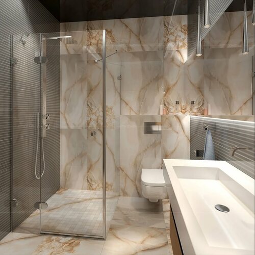 Идеи дизайна ванной комнаты с керамогранитом и ониксом
