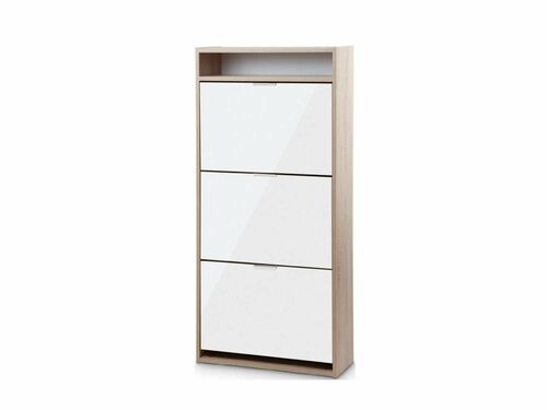 Обувница в белом глянцевом исполнении с элементами из дуба сонома - стильное и функциональное решение для организации хранения обуви в вашем доме. Этот предмет мебели сочетает в себе изысканный дизайн и практичность, идеально вписываясь в современный интерьер.
