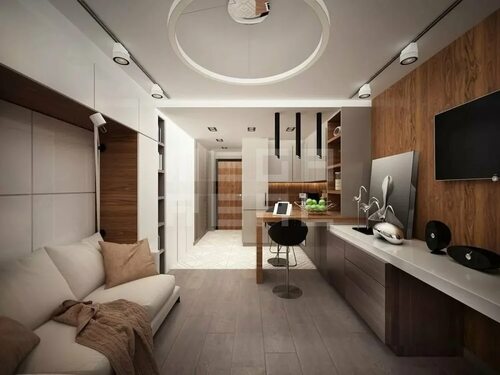 Одним из ключевых принципов дизайна прямоугольной студии 25 квадратных метров является минимализм и функциональность. Используйте многоуровневые полки и стеллажи для максимальной оптимизации пространства. Мебель с удобными механизмами трансформации поможет создать многофункциональные зоны, а светлые оттенки и зеркала в интерьере создадут ощущение простора.