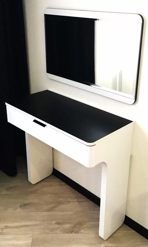 Черно-белый глянец создает эффектный контраст, придавая туалетному столику изысканный вид. Он может быть украшен декоративными элементами, зеркалами или фурнитурой, что делает его еще более привлекательным.