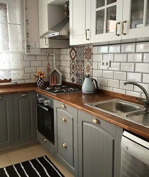 6. Фартук из керамической плитки с рисунком или узором, добавляющим художественный штрих в серую кухню.