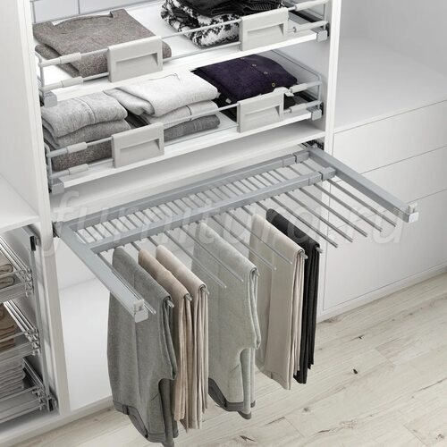 Другой вариант - использование выдвижных ящиков или корзин, в которых брюки будут храниться аккуратно сложенными. Это особенно удобно, если у вас много брюк разных цветов и фасонов, и вы хотите сохранить их в порядке.