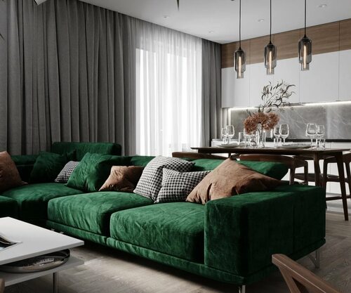 Интерьер гостиной с изумрудным диваном может быть оформлен в различных стилях, от классики до современности. Использование дополнительных элементов декора, таких как подушки, покрывала и картин, поможет создать гармоничное пространство, которое будет радовать вас и ваших гостей.