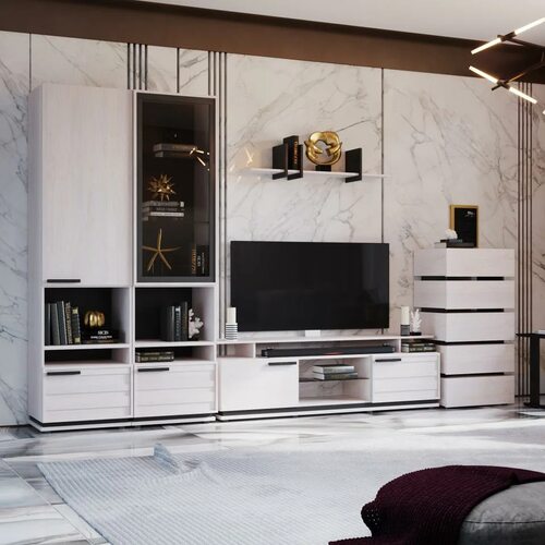 Коллекция предлагает широкий выбор предметов мебели, включая стеллажи, тумбы, столы и стулья, позволяя создать гармоничный интерьер гостиной комнаты.