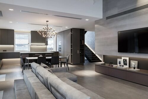 Современный стиль в дизайне кухни гостиной подразумевает использование минималистичных форм, нейтральных цветов и инновационных материалов. Открытая планировка помещений, большие окна и использование природного освещения также являются важными аспектами современного дизайна.