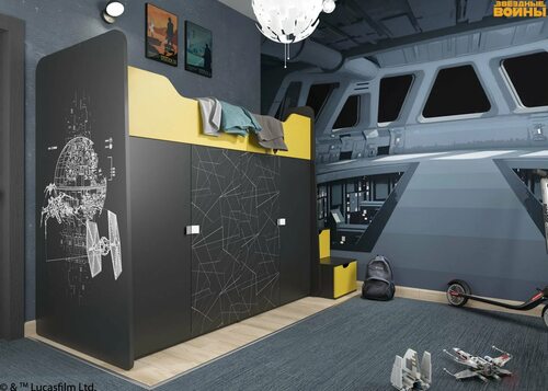 При создании дизайна детской комнаты в стиле \"Звездные войны\" особое внимание уделяется интерьеру. Используйте цветовую палитру, характерную для космических приключений: черный, синий, серебряный. Добавьте элементы декора, отсылающие к фильму, такие как модели звездолетов, световые мечи и плакаты с изображениями героев.