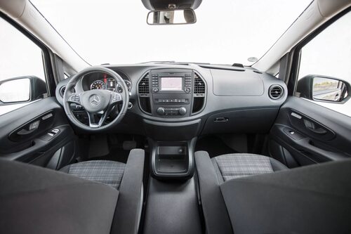 Интерьер Мерседес Вито представляет собой комфортное и функциональное пространство. Водительское место оборудовано удобным рулевым колесом и панелью приборов с ярким дисплеем. Сиденья обеспечивают отличную поддержку и комфорт даже на длительных поездках. Все элементы интерьера выполнены из качественных материалов, что придает салону роскошный вид.