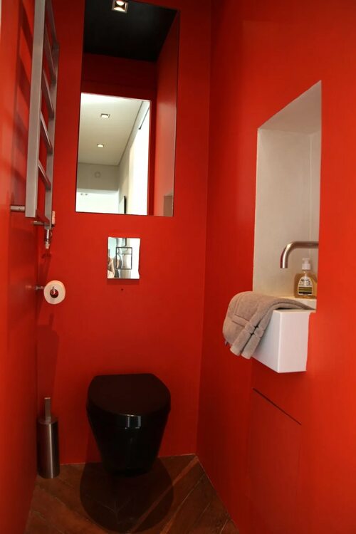 Фотографии интерьеров с красными унитазами представляют разнообразие стилей - от современных глянцевых ванных комнат до уютных и теплых интерьеров в загородных домах. Вы сможете найти вдохновение для создания своего собственного уникального интерьера.