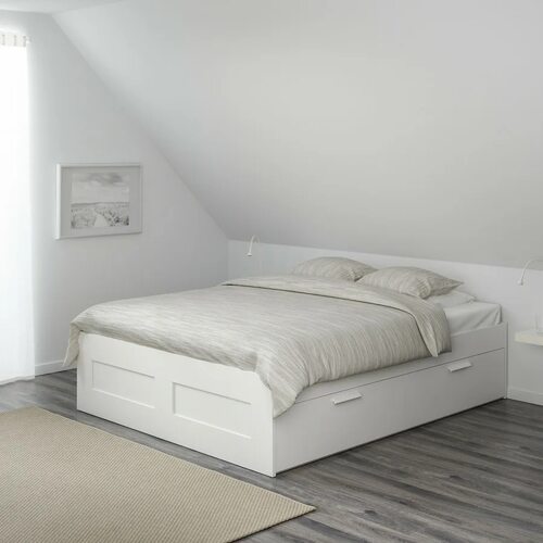 Каркас кровати с ящиками белый - это практичное и стильное решение для спальни. Белый цвет придает комнате светлоту и воздушность, а наличие ящиков обеспечивает дополнительное место для хранения вещей.