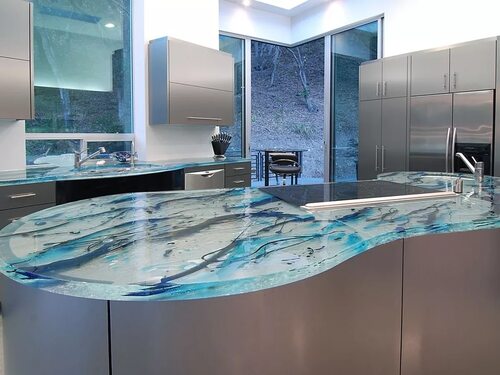Стекло, установленное под мраморную столешницу, создает эффектное сочетание материалов, придавая интерьеру изысканность и современный вид. Кроме того, стекло легко очищается, устойчиво к влаге и теплу, что делает его идеальным выбором для использования в кухонях и ванных комнатах.