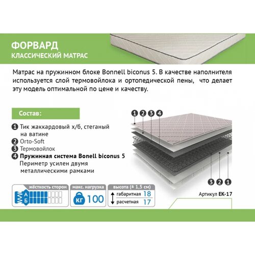 Матрас Форвард 160 200 изготовлен из высококачественных материалов, которые обеспечивают удобство и долговечность. Благодаря своим характеристикам, этот матрас подарит вам здоровый и полноценный сон каждую ночь.