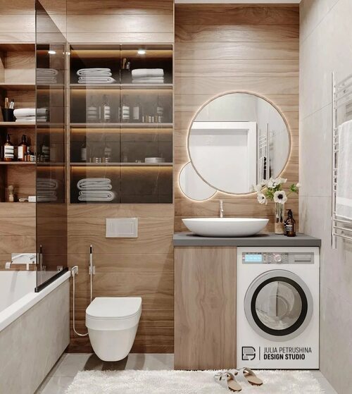 Ниже представлены фотографии интерьеров маленьких ванных комнат с установленной стиральной машиной. Просматривайте и находите вдохновение для создания своего идеального пространства.