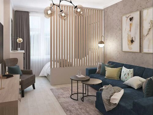 Декоративные элементы, такие как полки, параваны, стойки или дивидеры, могут быть использованы для физического разделения гостиной на разные зоны. Эти элементы не только помогут в зонировании, но и могут стать интересным декоративным акцентом.