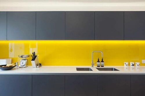 Кухня с желтым фартуком может стать ярким акцентом в интерьере. Желтый цвет ассоциируется с солнцем, теплом и радостью, поэтому он отлично подходит для создания уютной и приятной атмосферы на кухне.