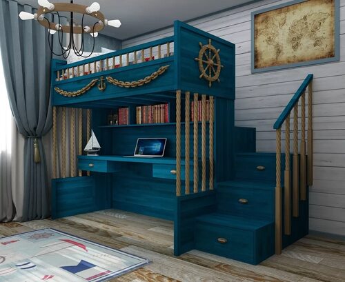 При создании интерьера с кроватью чердак в морской тематике можно вдохновляться морскими элементами, такими как якоря, рули, маяки, морские звезды и многое другое. Морская цветовая гамма, состоящая из оттенков синего, белого и коричневого, поможет создать атмосферу морского побережья.