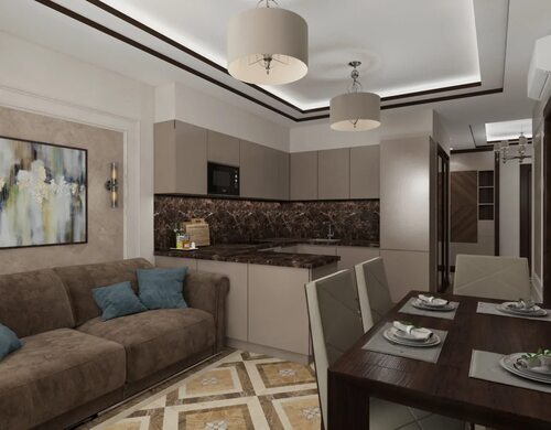 Одним из популярных вариантов дизайна кухни гостиной 16 кв м с диваном является минималистичный стиль. Он предполагает использование простых форм, нейтральных цветов и минимум декора. Функциональная мебель и компактные решения позволяют оптимально использовать пространство, создавая при этом уютную и стильную обстановку.
