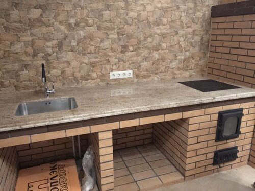 - Камень. Натуральный камень, такой как гранит или мрамор, придает столешнице элегантный и прочный вид. Он также хорошо переносит высокие температуры и устойчив к воздействию погодных условий.