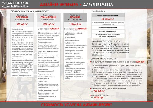 Пакет услуг дизайнера интерьеров представляет собой комплексный подход к созданию уникального и функционального дизайна помещений. Этот пакет включает в себя широкий спектр услуг, начиная от консультаций по выбору стиля и цветовой гаммы, заканчивая разработкой дизайн-проекта и его реализацией.