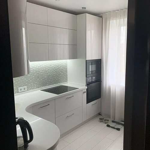 Узкие шкафы, скрытые хранения и компактное размещение устройств - вот основные принципы дизайна кухни в современном стиле на площади 5 кв м.