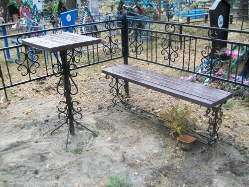 Столик с лавкой на кладбище обычно выполнен из прочных материалов, таких как камень, мрамор или дерево. Он может иметь различные узоры и украшения, отражающие индивидуальность и память о покойных. Часто на таких столиках можно увидеть цветы, свечи и другие предметы, которые люди приносят в знак уважения и памяти.