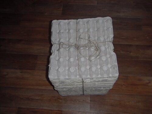 Используя яичные лотки, создайте круглую основу для пуфика. Склейте лотки вместе так, чтобы получилась прочная и устойчивая конструкция.