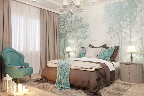 Бирюзовые тона могут быть использованы как основной цвет интерьера спальни или как акцентный элемент. Они отлично сочетаются с нейтральными оттенками, такими как белый, серый или бежевый, создавая гармоничное сочетание цветов. Фотообои с бирюзовыми оттенками могут стать центральным элементом дизайна, добавляя интересный узор или изображение на стену.