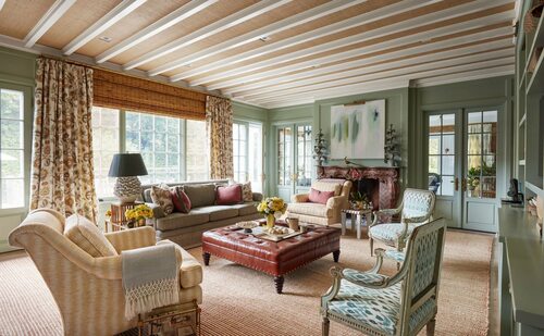 Гостиная в деревянном доме в американском стиле может быть оформлена с использованием натуральных материалов, таких как дерево и камень. Открытые балки и потолок из натурального дерева создадут атмосферу тепла и уюта. Мягкая мебель в теплых оттенках и декоративные элементы в стиле кантри добавят уютный шарм этому пространству.