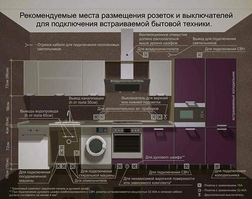 На фотографиях ниже вы можете увидеть примеры правильной установки розеток на кухне для встраиваемой техники.