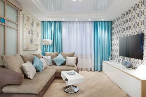 Интерьер гостиной с бирюзовыми шторами предлагает уникальное сочетание цветов и текстур, создавая атмосферу роскоши и комфорта. Бирюзовый цвет придаст вашему интерьеру свежесть и яркость, а шторы станут ярким акцентом в оформлении помещения.
