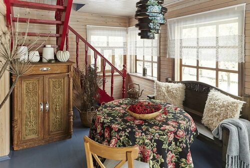 В русском стиле интерьера дачного дома часто используются деревянные балки, резные элементы, печи, иконы, народные узоры и ткани. Это придает помещению особый колорит и делает его уникальным.