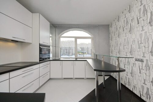 Белая кухня с черной столешницей является классическим и элегантным выбором для многих домов. Чтобы добавить индивидуальности и стиля этому интерьеру, можно использовать обои, которые подчеркнут красоту и функциональность кухонного пространства.