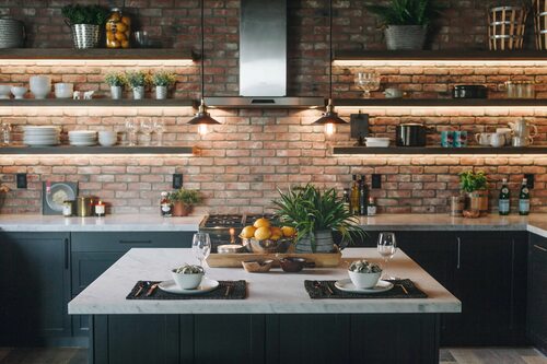 Кухня с красным кирпичом