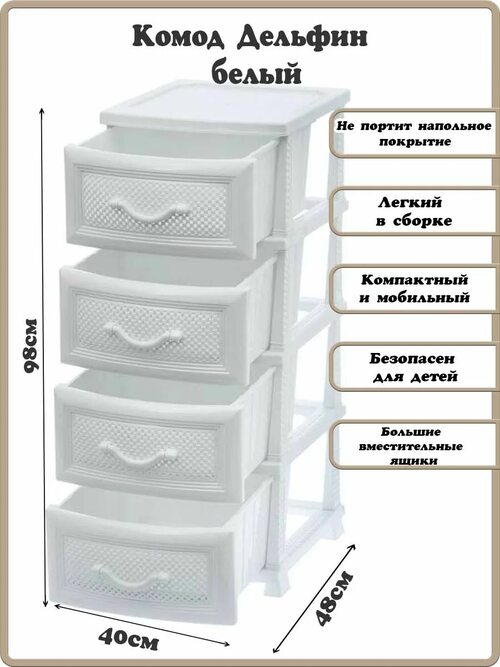 Пластмассовые комоды предлагаются в различных размерах, начиная от компактных моделей с несколькими ящиками до более крупных вариантов с большим количеством отделений. Благодаря этому, вы можете подобрать комод, который идеально подойдет для хранения вашего имущества.