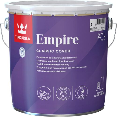 Краска Tikkurila Empire алкидная для мебели универсальная полуматовая база A - это превосходное решение для окраски мебели. Она обладает высоким качеством и долговечностью, что делает ее идеальным выбором для любого проекта по обновлению интерьера.