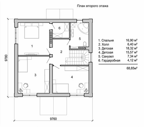 План двухэтажного дома с 3 спальнями на втором этаже