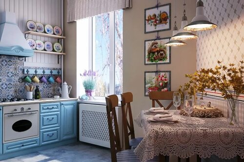 Одним из ключевых элементов стиля прованс являются пастельные оттенки. Нежные голубые, мятные, лавандовые и песочные цвета прекрасно подходят для стен на кухне. Выберите один или несколько оттенков и создайте неповторимый фон для вашей кухни.