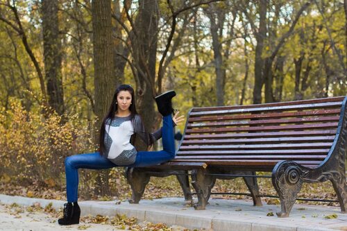 Сядьте на скамейку, скрестив ноги, и повернитесь камере. Эта поза придаст вашей фотографии изысканности и элегантности.