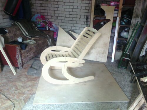 Далее приступайте к созданию сиденья и спинки кресла-качалки. Отрежьте соответствующие части из ДСП, затем прикрепите их к основе кресла. После этого проведите шлифовку, чтобы убрать острые края и придать изделию гладкую поверхность.